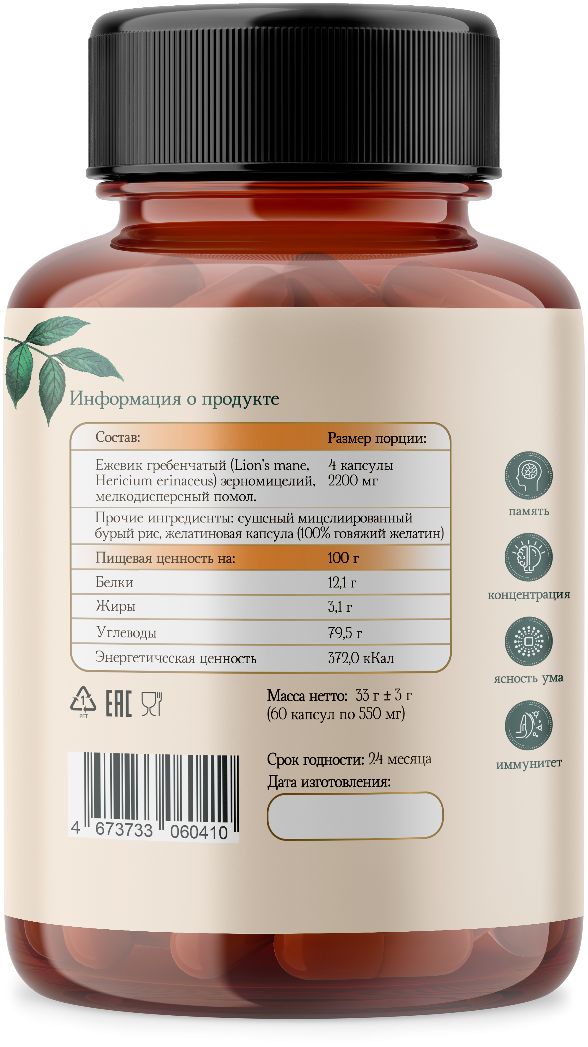 • В 1 капсуле — 0,4 г порошка из высушенного тела ежовика