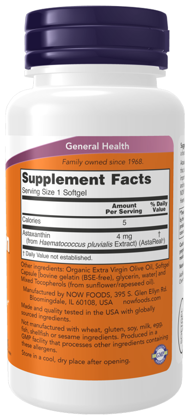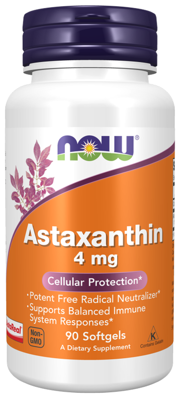 Астаксантин - это природный каротиноид, который благодаря своей уникальной структуре играет важную роль в защите клеток от свободных радикалов и здоровых реакциях иммунной системы.Now Астаксантин получен из микроводорослей Haematococcus pluvialis, не содержащих ГМО.