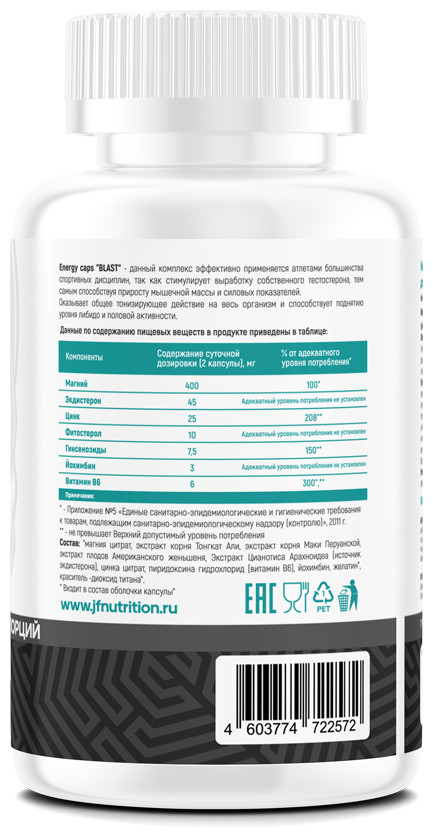 магния цитрат, экстракт корня Тонгкат Али, экстракт корня Маки Перуанской, экстракт плодов Американского женьшеня, Экстракт Цианотиса Арахноидеа (источник экдистерона), цинка цитрат, пиридоксина гидрохлорид (витамин В6), йохимбин, желатин, краситель -диоксид титана.