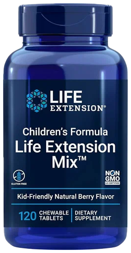 Легкая в разжевывании таблетка Children's Formula со вкусом ягод, содержащая ингредиенты Life Extension Mix в концентрации, подходящей для детей от 4 лет и старше, содержит 18 необходимых витаминов и минералов, в том числе витамины A, C и D.