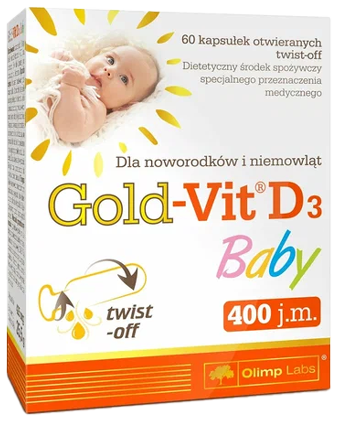 Gold-Vit D3 Baby - диетическая добавка для особых медицинских целей. Препарат содержит витамин D, необходимый для правильного роста и развития детских костей и минерализации зубов.