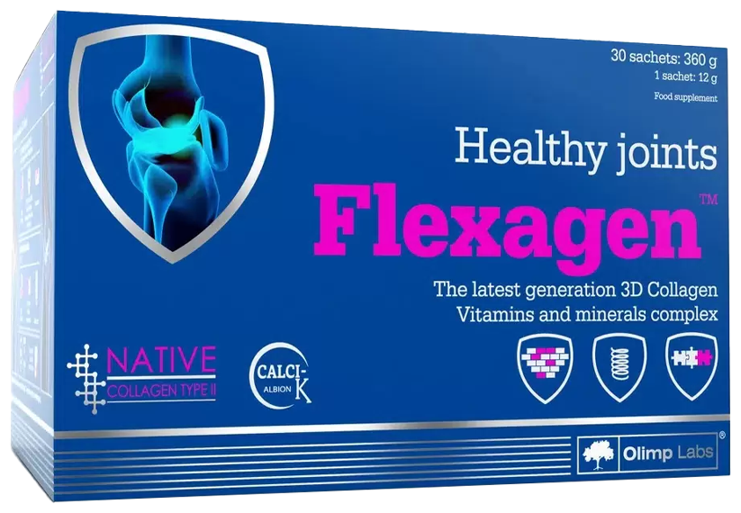 Flexagen - это препарат, содержащий две формы коллагена, дополнительно обогащенный витаминами и минералами, что способствует поддержанию здоровья соединительных тканей.