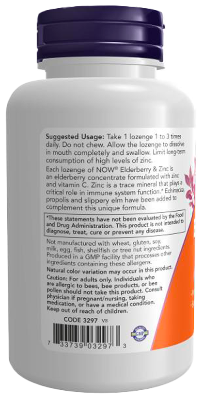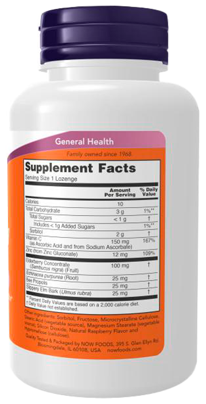Каждая пастилка с бузиной и цинком от NOW представляет собой концентрат бузины, который содержит цинк и витамин C. Цинк - микроэлемент, играющий важнейшую роль в работе иммунной системы. Эхинацея, прополис и красный вяз дополняют эту уникальную формулу.