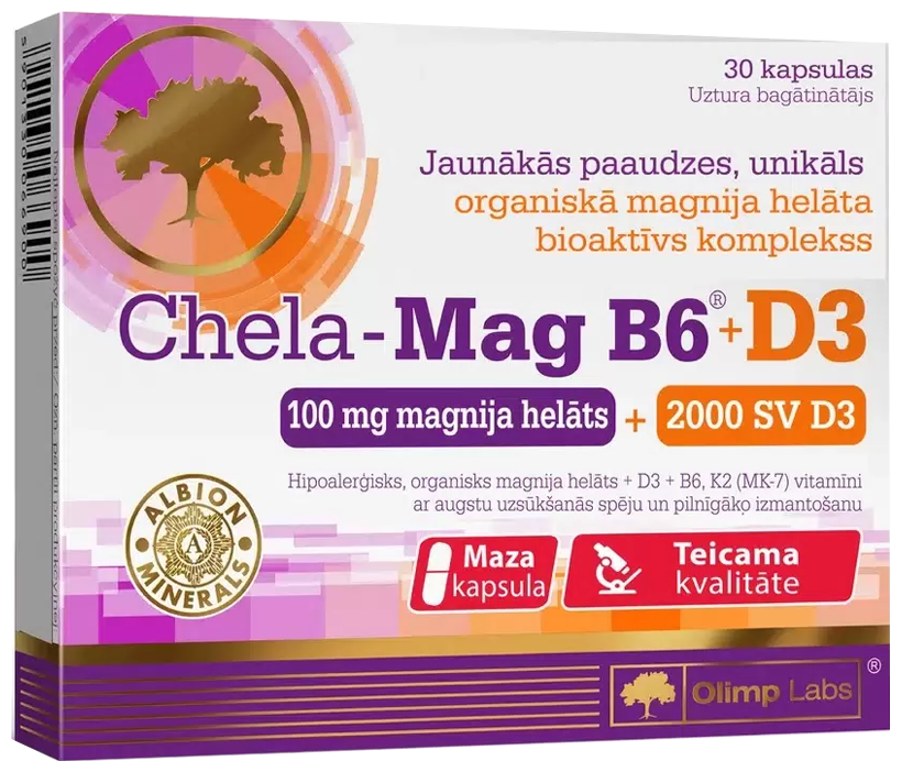 Chela-Mag B6 + D3 - это пищевая добавка с уникальным сочетанием высокобиодоступного магния в форме хелата аминокислот Albion с 2000 МЕ витамина D3 и витаминами B6 и K2. Магний является важным элементом в биосинтезе активной формы витамина D.