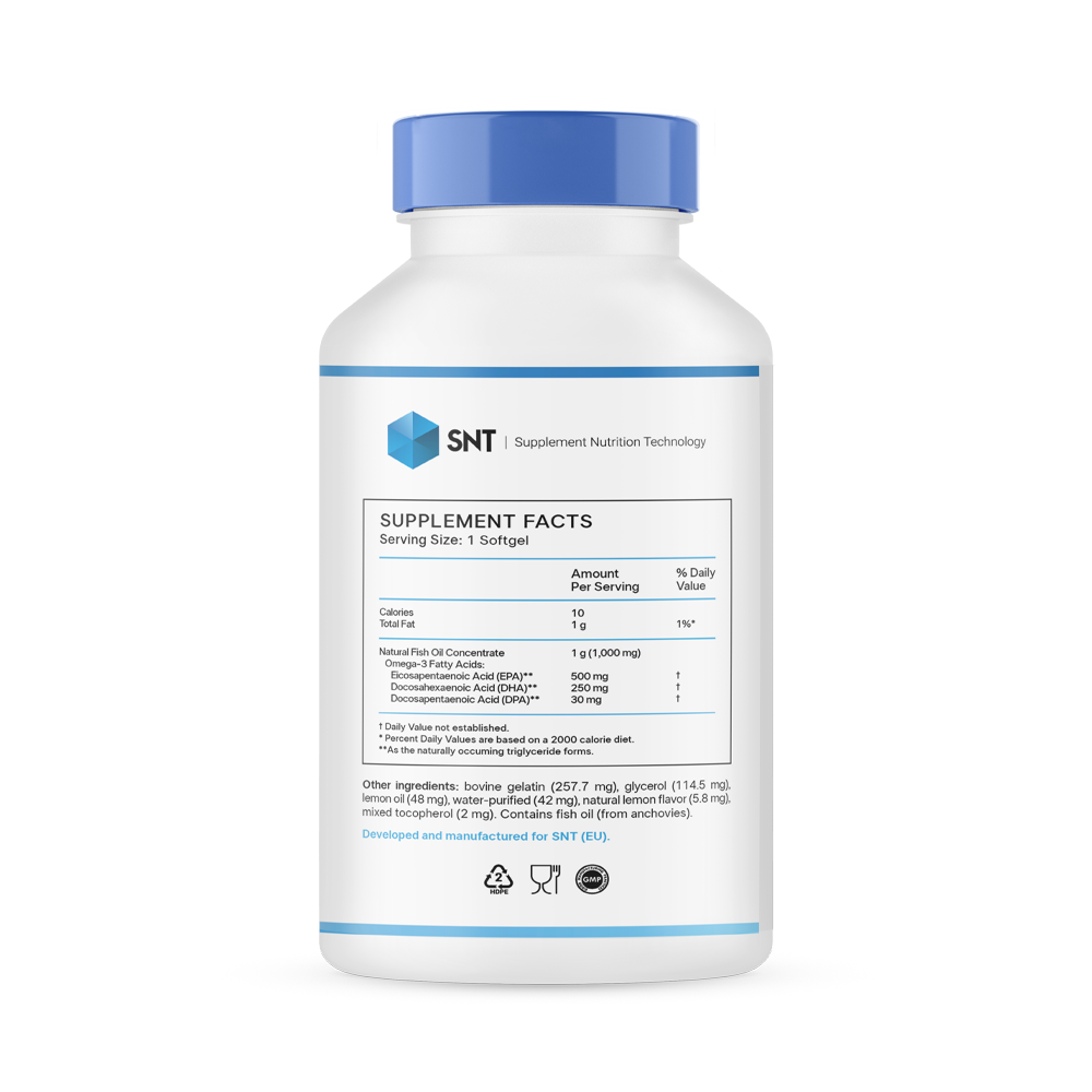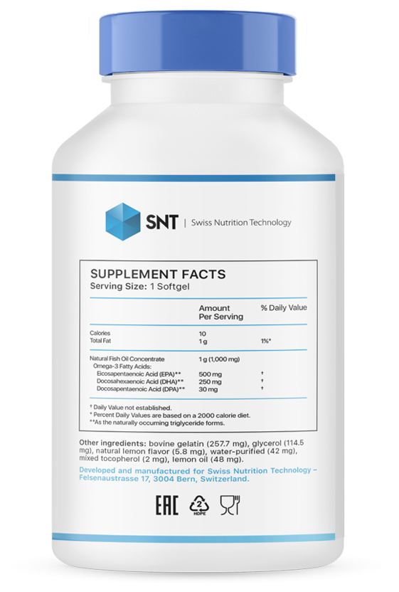 говяжий желатин (капсула) 257,7 мг, глицерин 114,5 мг, масло лимона 48 мг, очищенная вода 42 мг, натуральный ароматизатор лимон 5,8мг, концентрат смеси токоферолов 2мг. Источник омеги-концентрат рыбного жира (из анчоусов).