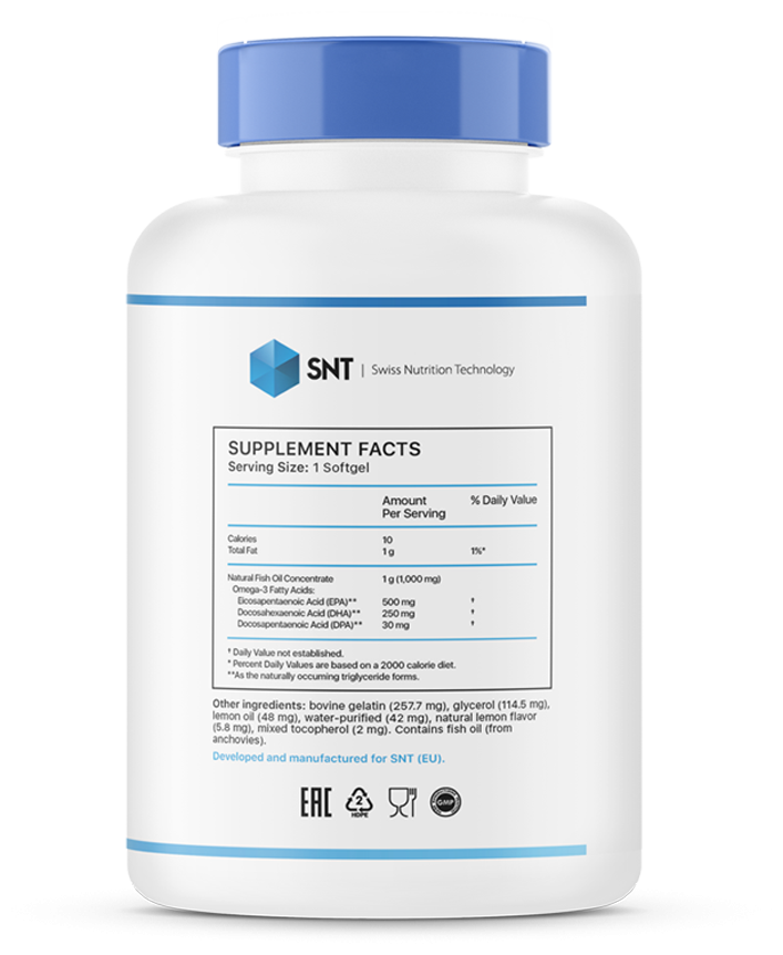 говяжий желатин (капсула) 257,7 мг, глицерин 114,5 мг, масло лимона 48 мг, очищенная вода 42 мг, натуральный ароматизатор лимон 5,8мг, концентрат смеси токоферолов 2мг. Источник омеги-концентрат рыбного жира (из анчоусов).