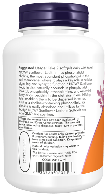 Подсолнечный лецитин содержит фосфатидилхолин, самый распространенный фосфолипид в клеточной мембране, который играет ключевую роль в сигнальной и синаптической функции клеток. Кроме того, подсолнечный лецитин содержит большое количество природного фосфатидилинозитола, фосфатидила этаноламина и незаменимых жирных кислот. Лецитин в рационе помогает эмульгировать жиры, позволяя им растворяться в воде. Организм с легкостью усваивает и использует холин, содержащийся в этом фосфолипиде.