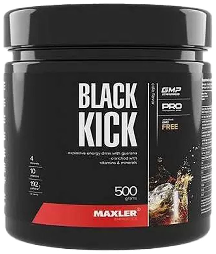 Black Kick - это порошок для спортивных напитков, который обеспечивает энергией перед тренировкой. Он содержит 192 мг кофеина и гуарану, что повышает умственную работоспособность и заряд энергией.
