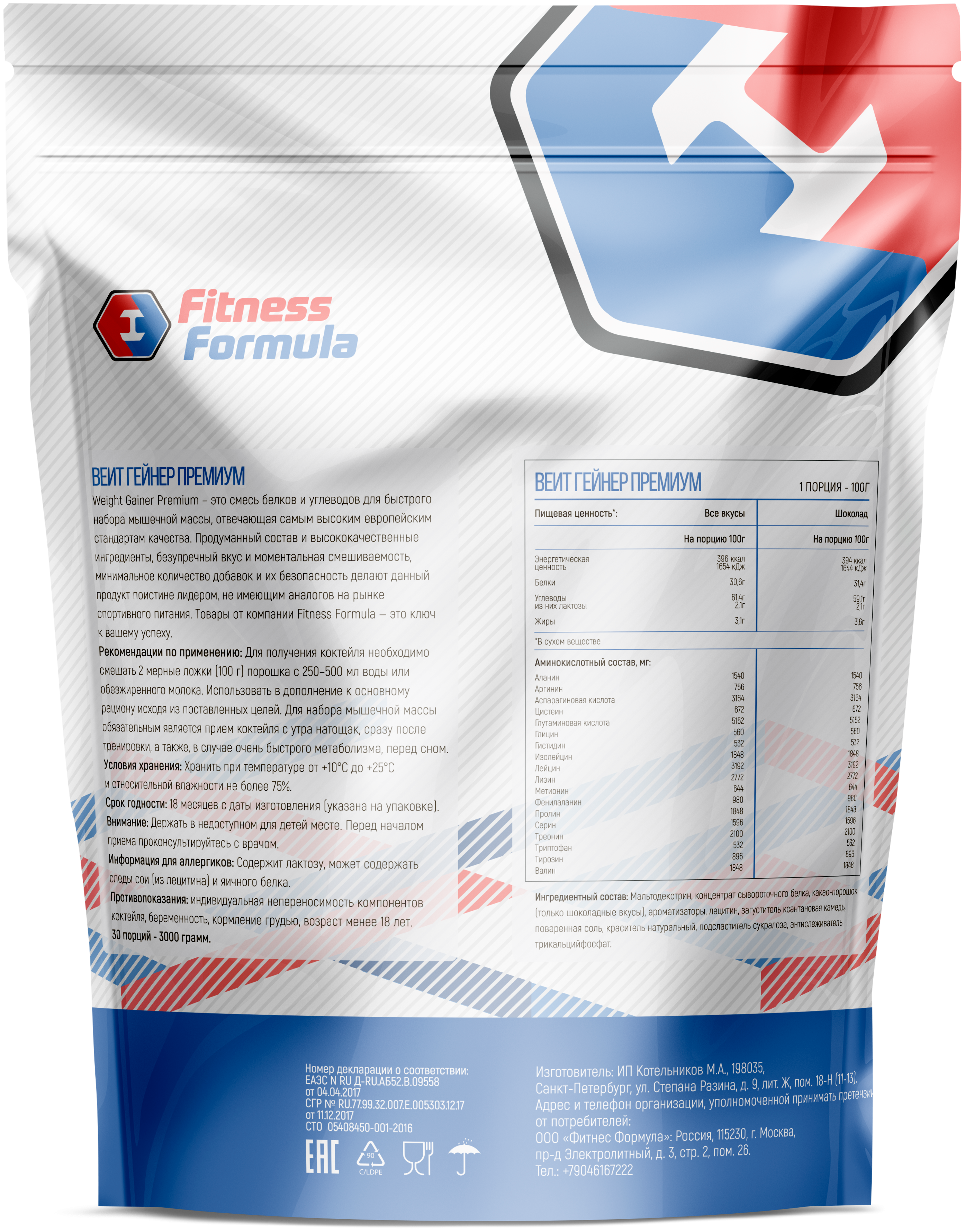 Fitness Formula 100% Weight Gainer Premium, 3000 г