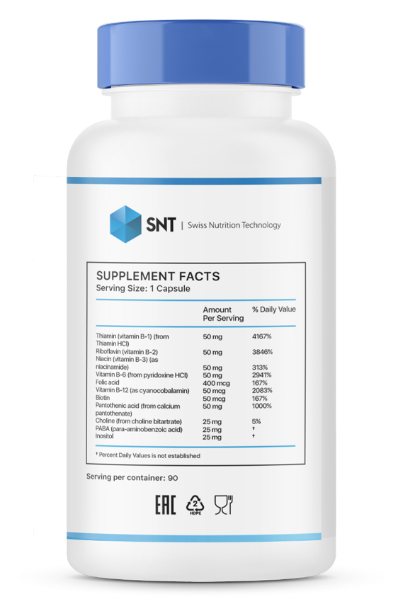 B-50 - это комплексная диетическая добавка, содержащая витамины группы B, включая тиамин (B1), рибофлавин (B2), ниацин (B3), пантотеновую кислоту (B5), пиридоксин (B6), биотин (B7), фолиевую кислоту (B9) и кобаламин (B12). Эти витамины играют ключевую роль в метаболизме энергии, поддержании нервной системы, укреплении иммунитета и улучшении общего состояния организма.